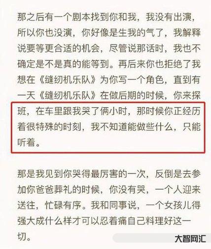 大鹏曾在写给柳岩的信里透露,有一天《缝纫机乐队》做后期时,柳岩去探班,在车里跟他哭了两个小时。他知道柳岩正经历很特殊的时刻,不知道自己能做些什么,只能听着。